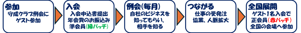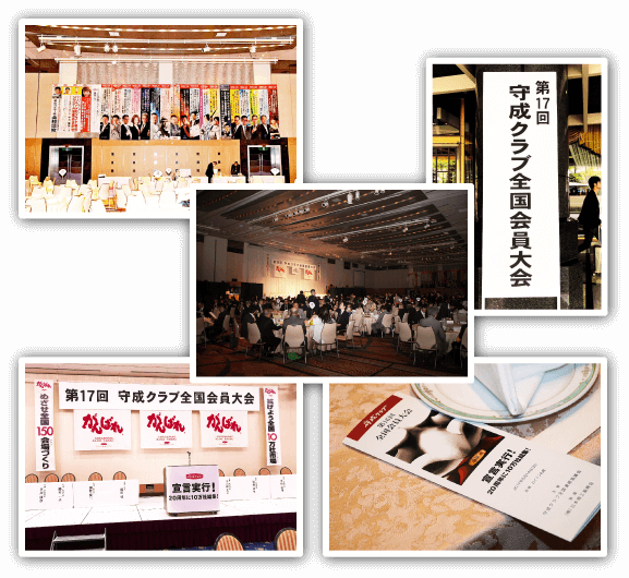 守成クラブは、単なる異業種交流とは違い「商売繁盛」を前面に打ち出し、「本音で自社をPRし互いに商売(実利)に徹して売上を伸ばす」 ことを第一の目的としています。